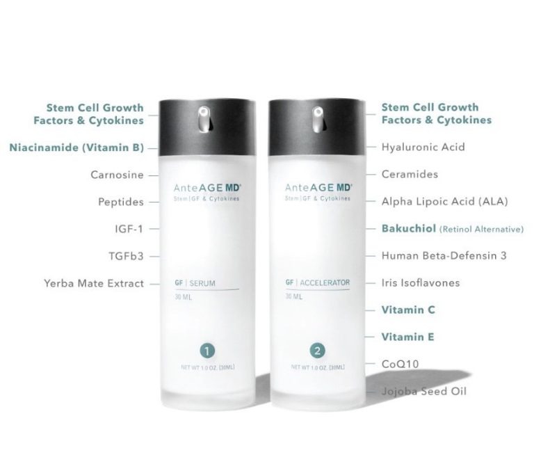 AnteAGE là dòng sản phẩm chứa các growth factor và cytokine được nuôi cấy từ tế bào gốc tủy xương; thường sử dụng dưới dạng serum, dung dịch dành cho lăn kim chuyên dụng và một số chế phẩm hỗ trợ trẻ hóa. Thành phần hay gặp gồm hyaluronic acid, các peptide kích thích tái tạo, cùng một số chất bảo quản như benzyl alcohol và dehydroacetic acid. Những thành phần này tác động vào quá trình phục hồi da và có khả năng làm giảm viêm khi dùng đúng cách.