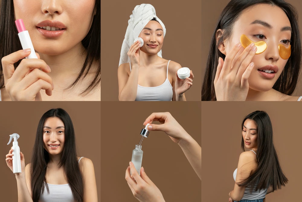 các bước skincare. Hình ảnh này cho thấy một phụ nữ trẻ đang thoa các sản phẩm trang điểm và chăm sóc da khác nhau lên khuôn mặt của mình