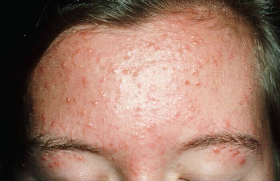 • Mọc theo cụm với kích thước đồng đều, thường là các sẩn nhỏ hoặc mụn mủ rải đều.