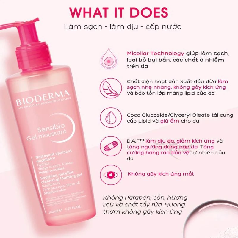 Sensibio Gel Moussant Da thường đến nhạy cảm Micellar làm sạch dịu, công thức tăng dung nạp, hỗ trợ dưỡng ẩm Gel tạo bọt nhẹ Theo hãng: không mùi, không xà phòng Da siêu nhạy cảm vẫn cần theo dõi khi sử dụng sữa rửa Bioderma
