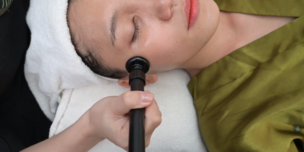 - Bước 4: Massage mặt bằng đồng nguyên khối giúp giảm các gốc tự do khiến da suy yếu